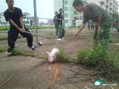 Imagens chocantes que chegam de Nanning, na China. Um grupo de jovens tortura e mata porcos de forma sádica, batendo-lhes com tubos de ferro e enforcando-os na barra do recreio. O sítio mop.com publicou as fotografias daquilo que aparentemente seria um treino de ciência forense de uma escola de polícia, realizado no último dia 5 de Julho, e destinada a agentes de investigação criminal. Esta "ciência forense" foi exemplificada com porcos vivos, que foram enforcados, estrangulados, afogados e espancados até à morte, e deixou os internautas chineses chocados. A maioria deles questiona os valores da sociedade em geral, e questiona-se sobre a necessidade de sacrificar seres vivos de forma tão cruel em experiências científicas. Um comentador da mop.com deixou um comentário muito curioso: