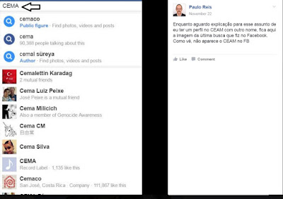 CEMA?? CEMA??? Terra chamando Paulo Reis. Alô Paulo Reis. E entretanto já ele "afiava a faca", usando uma expressão do próprio, para "pedir satisfações" aos elementos do grupo que alegadamente o havia "banido" - COITADINHO! Como se alguém lhe devesse satisfações ou outra coisa qualquer, para esse efeito. Isto dos "print-screens", que parece incomodar "a casa" apenas quando dá vantagem aos forasteiros, não são "devassa" de coisa nenhuma, como afirmou o seu "camarada" chanfradinho da Silva - aquilo que você PUBLICA é PÚBLICO, como o nome indica. Você é - ou foi ou sei lá nem me interessa - jornalista, certo? Deve saber muito bem do que falo. O que constitui crime de devassa, outra figura do Código Penal, leitura que lhe recomendo para o seu próprio bem, é fazer-se passar por outra pessoa, ou ainda tentar aceder a contas de internet alheias. Soa-lhe a algo familiar? Ah, claro que não. Isso será para o "não-Paulo Reis" explicar.