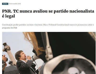 Esta, de um dos dirigentes do PNR, que garante que o partido "não defende nenhuma ideologia ditatorial" - aquela de "nacionalistas contra os outros todos" é para interpretar no contexto da luta ideológica, portanto, e se os "outros todos" são cobardes, traidores e escória, é porque são mesmo, pronto. Agora, dizer que o Tribunal Constitucional reconheceu o partido, só se for à luz da velha máxima do "quem cala consente":