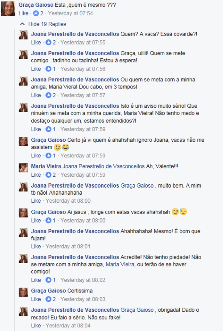Joana Perestrello de Vasconcellos, membro da comissão política (?) "et all" do tal partido que se diz "nacionalista". Eu não conheço a senhora nem tenho nada pessoal contra ela, mas por uma questão de bom senso, que tal marcar uma consulta num bom psiquiatra? A criatura diz-se de um partido político "democrático", e depois vai dizer aquelas coisas para uma página de uma rede social, que recordo que é pública, toda a gente consegue ver (toda a gente que não tenha sido bloqueada pelo Nando, esse pretenso paladino da "liberdade de expressão e não sei quê)? E ela jura que está a falar a sério quando diz que quer "partir os dentes" à Catarina Martins! Querem ver?