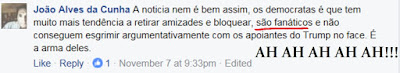 Julgo que nem é preciso mencionar que esta conversa teve lugar numa altura em que Hillary Clinton ainda era dada como mais que provável sucessora de Barack Obama. Mas que graça, que "fair play", e o que é aquilo, uma apoiante do Trump, aparentemente americana, a dizer que "abandona o país" se a candidata democrata ganhar. Deve ser uma excepção, pois essa idiotice é exclusiva "dos outros", então? Bem, pelo menos não recorreram a "insultos violentos", que não sei se o meu pobre coração aguentava! Ou querem ver que...